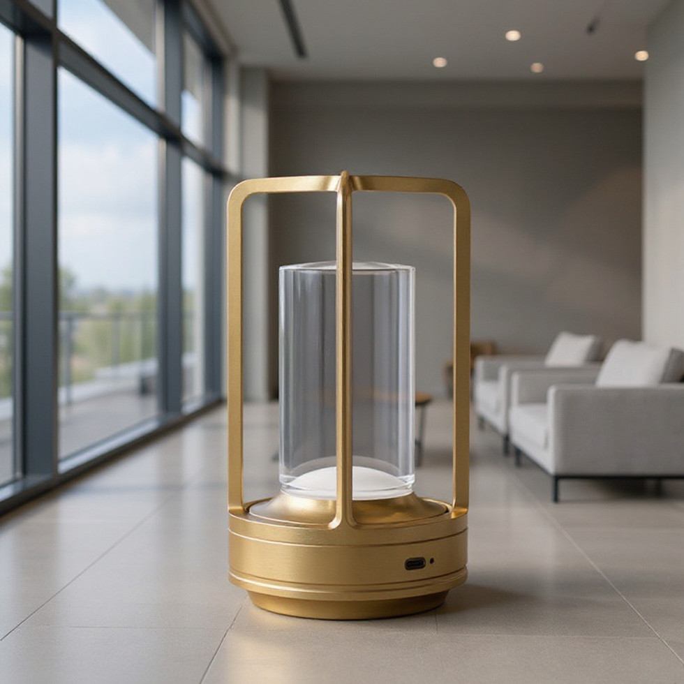 A modern lantern-style LED lamp framed in metal with a glass cylinder center. Designed for flexible placement and warm ambient light.